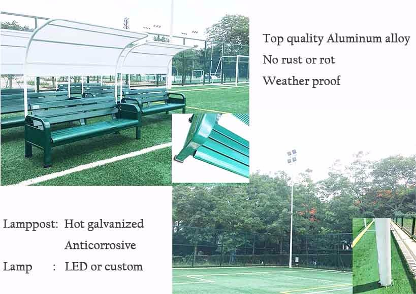 Aluminum alloy soccer team shelter,lamppost and LED lamp,top net and distribution cabinet